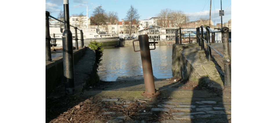 It is still possible to see reminders of these ferries around the harbour. Close by Merchants Landing there was a ferry from Wapping Road, landing point still used, across to Canon’s Marsh. Further upstream was the Guinea Street, or Grove ferry which ran from the clearly visible slip near the Ostrich (picture above) to a slip now incorporated in the River Station restaurant on the Grove. Redcliffe ferry crossed from Redcliffe Back to Welsh Back. The Redcliffe entrance at the end of Ferry Lane can be found between the old WCACA building (now affordable accommodation) and the near derelict concrete warehouse adjacent. Then there was the Counterslip ferry, much older, crossing the harbour above Bristol Bridge to provide a link from Bristol Castle to Temple Back; to the “Countess Slip” in fact. It was replaced by a bridge in 1841 on which a toll of ½d was levied until 1875. Hence old Bristolians know it as “The Ha’penny Bridge”.